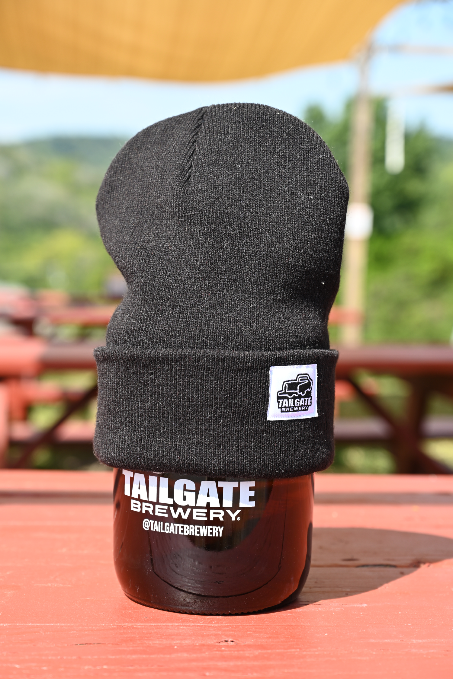 A supersoft knit beanie in black with a roll up cuff and truck logo vegan leather stamp.